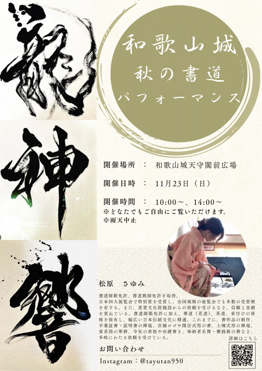 和歌山城天守閣前広場にて、書家・松原さゆみさんによる「秋の書道パフォーマンス」を開催します。 力強く躍動感のある筆致で作品を仕上げる様子を、どなたでも自由にご覧いただけます。 青空の下で行われるライブ書道ならではの迫力を、ぜひ会場でお楽しみください。 開催日:2025年11月23日(日) 開催時間:10:00~、14:00~(2回開催) 場所:和歌山城 天守閣前広場 ※雨天中止 ※観覧自由