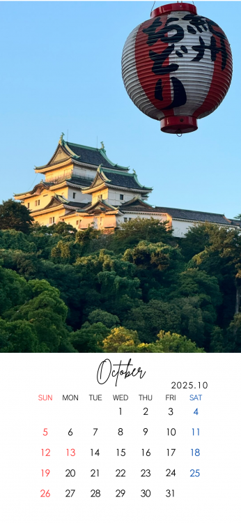 「和歌山城フォトコンテスト2025夏」で最優秀賞に選ばれた作品を、スマートフォン用の【10月カレンダー付き壁紙】として配布いたします。 受賞作品を毎日の生活の中でお楽しみいただけるよう、特別にカレンダー仕様にしました。 端末に合わせて、以下の3種類からダウンロードできます。 ご自身のスマートフォンに合わせてご利用ください。 【iPhone版】http://wakayamajo.jp/image/iPhone.png 【Android版】http://wakayamajo.jp/image/Android.png 【汎用版】http://wakayamajo.jp/image/hanyou.png