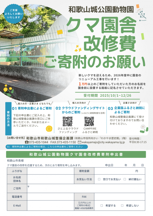 和歌山城公園動物園では、2026年度中にクマ園舎のリニューアル工事を行う予定です。 プールや日よけの更新、寝室の排水改善など、新しいクマが生活しやすい環境に改修します。 より多くの方と新しいクマを出迎えたいため、クマ園舎改修費への応援をお願いいたします! 【寄附の方法】 ①寄附申出書によるご寄附(個人の方・企業さま どなたでも) チラシ下部の寄附申出書 もしくは クマ園舎改修費寄附申出書(http://wakayamajo.jp/pdf/kuma-kihu.xlsx) にご記入いただき、和歌山城整備企画課の窓口にお持ちいただくか、 FAX(073-435-1150)またはメール(wakayamajo@city.wakayama.lg.jp) でご送付ください。 ②クラウドファンディングサイトからのご寄附(個人の方向け) さとふるクラウドファンディング (https://www.satofull.jp/projects/business_detail.php?crowdfunding_id=615) または CAMPFIREふるさと納税 (https://camp-fire.jp/projects/892569/view) にて受け付けております。 ③企業版ふるさと納税によるご寄附(企業さま向け) 和歌山城整備企画課にて受け付けておりますのでお問い合わせください。 【ご寄附受付期間】 2025年10月1日~12月26日 返礼品などのご用意はありませんが、1万円以上のご寄附をしていただいた方のお名前を 園舎前に設置する銘板に記名させていただきます。 皆さまからの温かいご支援をどうぞよろしくお願いいたします。